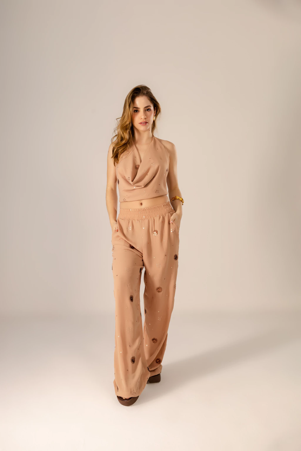 Conforto e estilo caminham juntos nessa calça reta com cós de elástico. Confeccionada em tecido leve e fluido, ela possui forro interno que garante segurança e acabamento impecável. Os bolsos frontais funcionais somam praticidade à peça, enquanto a silhueta ampla e elegante permite que ela transite com facilidade do beachwear ao look casual chic para sair à noite ou em dias de verão.