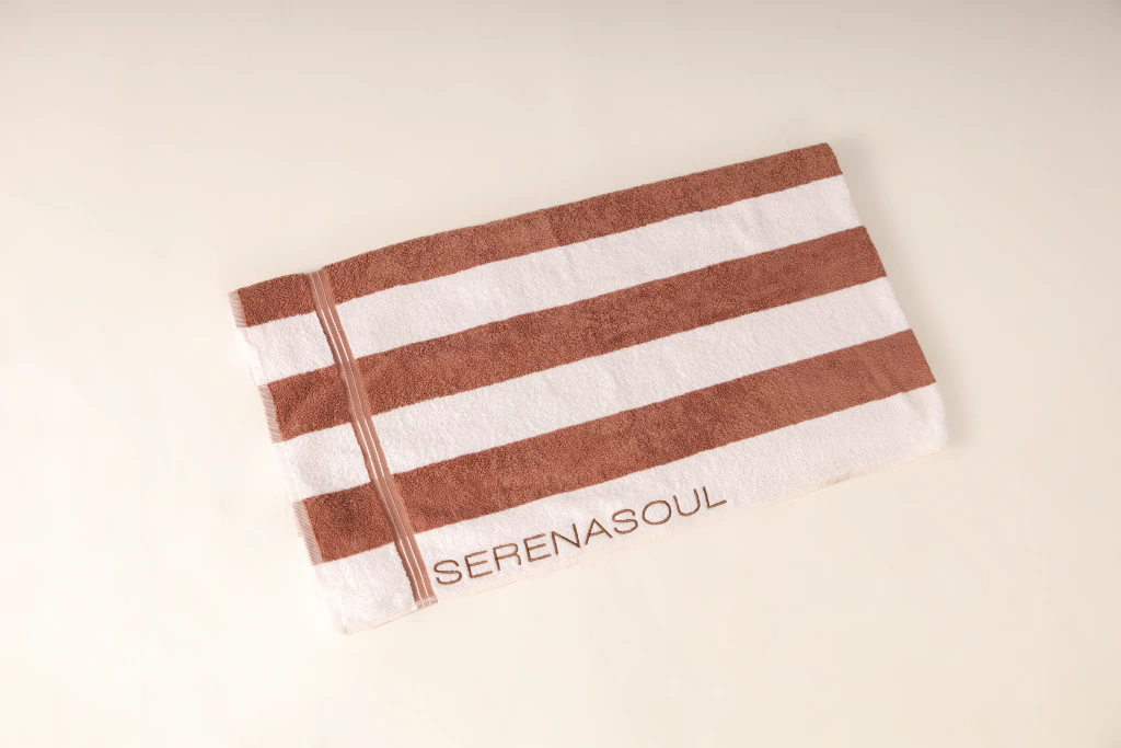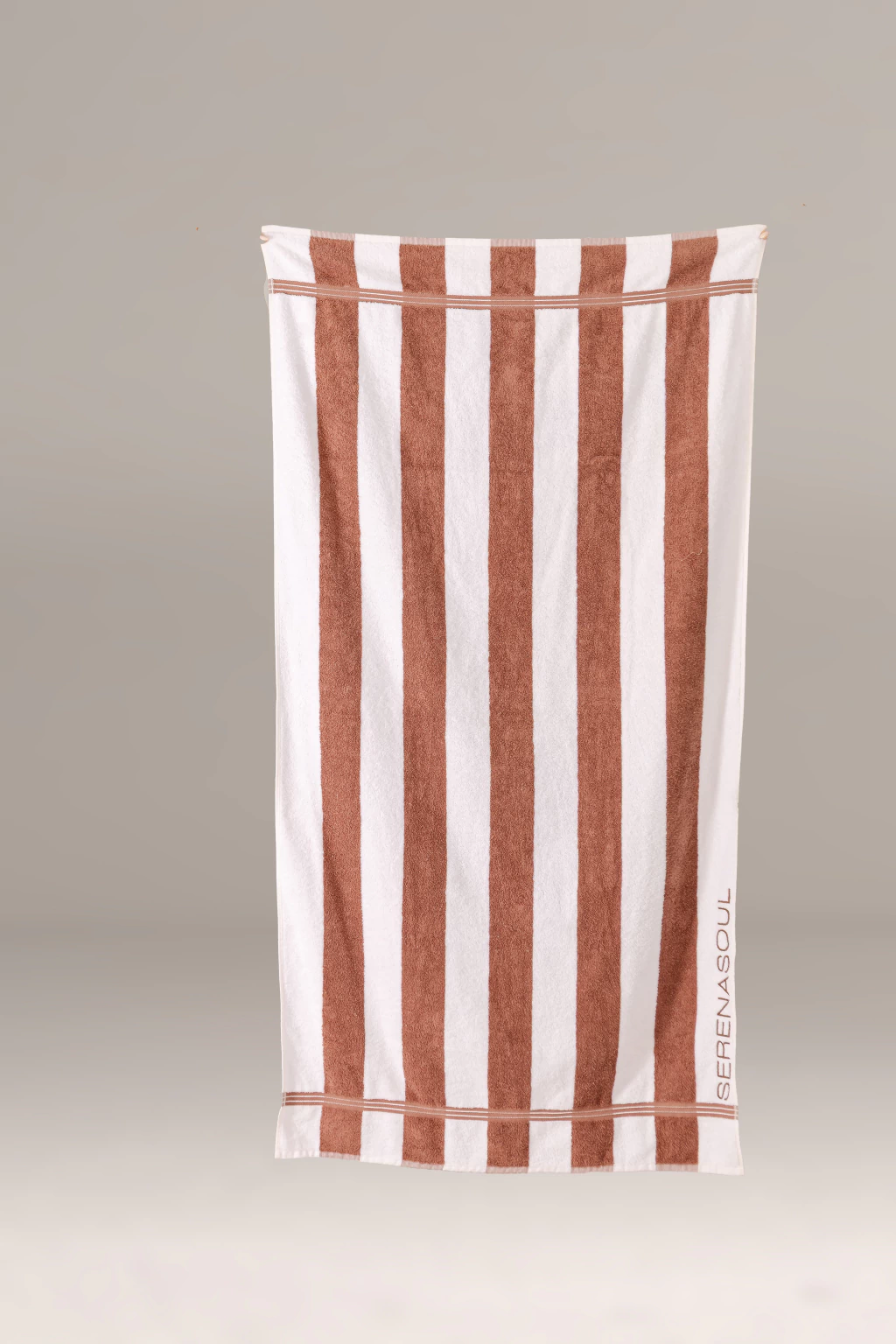 Com design clássico e atemporal, a toalha de praia Serena Soul é perfeita para acompanhar seus dias de sol. Confeccionada em tecido felpudo 100% algodão de alta qualidade, oferece maciez, excelente absorção e conforto ao toque. O modelo traz listras largas em tom terroso combinadas ao branco, além do logo bordado, garantindo um visual elegante e sofisticado à beira-mar ou na piscina.